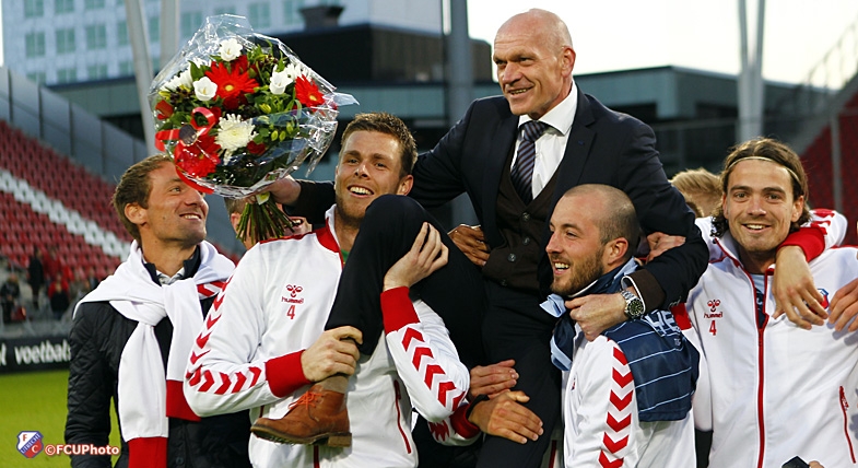 FC Utrecht heeft na afloop van de gewonnen wedstrijd tegen Vitesse (2-1) afscheid genomen van een aantal spelers. Ook trainer Jan Wouters en FC Utrecht-man Henk Vonk zwaaiden uit.