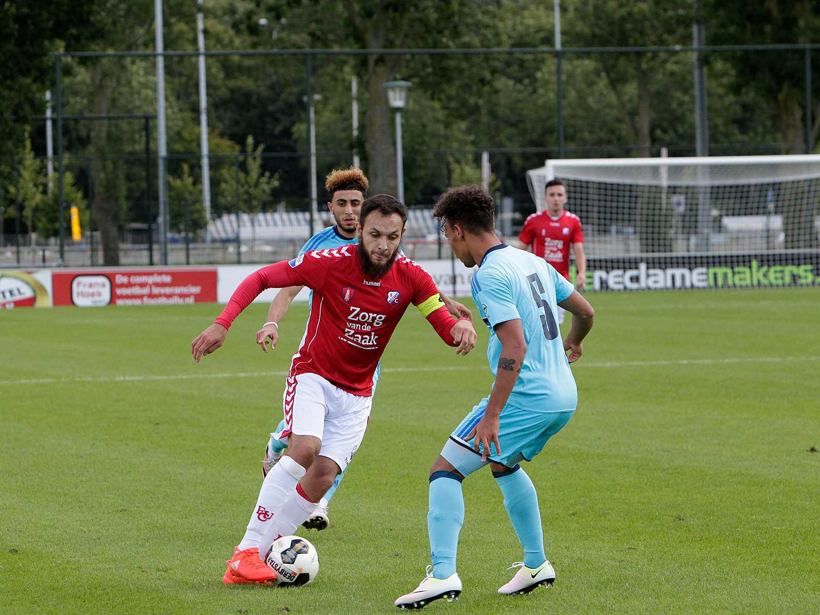 Van voet naar voet gaat het Derbystar-leer, en in hoog tempo ook. De reserves van FC Utrecht – een mix van spelers van het eerste team, de beloftenploeg en de O19 – laten goed voetbal zien tegen de Feyenoord Reserves, die te gast zijn in de Domstad.