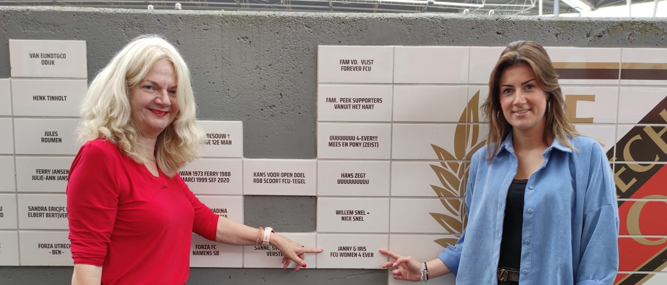 Janny & Iris, FCU WOMEN 4 EVER. Zo luidt de naam die op de tegel te bewonderen is, en Janny licht toe: “Ik kreeg een tip voor een naam die heel erg van toepassing is op ons. Wij blijven ons cluppie trouw, in goede maar ook zeker in slechte tijden, daar is geen enkele twijfel over.”