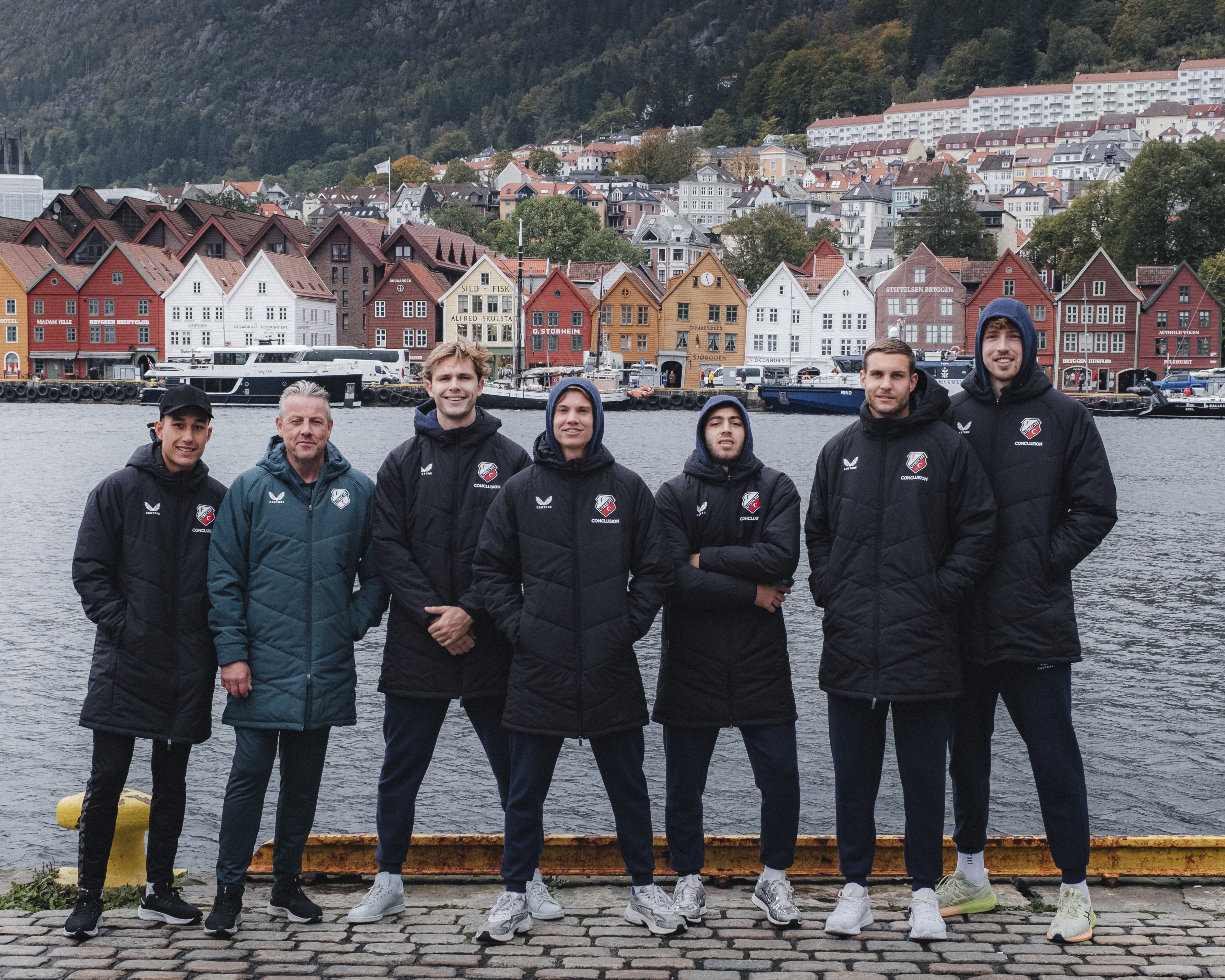 De tweede dag in Bergen start rustig. Terwijl de stad langzaam ontwaakt, trekken groepen FC Utrecht-supporters eropuit om de omgeving te verkennen. Ze wandelen door de binnenstad, langs de kleurrijke houten huisjes en de haven, en pakken de kabelbaan naar de top van de Fløyen. Boven aangekomen hebben ze een panoramisch uitzicht over de stad en de fjord. Voor wielerliefhebbers is het een bijzondere plek: hier pakte Tom Dumoulin in 2017 zijn wereldtitel op het WK tijdrijden.