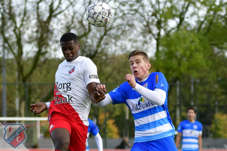 Om nou te zeggen dat Utrecht slecht begon aan de wedstrijd, zoals de laatste twee keer, nee! Desondanks waren er weinig kansen te noteren, want de Utrechtse voorhoede gaf de eerste helft 'niet thuis'. De tegenstander kwam ook nauwelijks tot een goede aanval en dus ook niet tot scoremogelijkheden. Dat veranderde echter na een half uur, toen bij een vrije trap Utrecht spits Mees Rijks zijn tegenstander, Gijs van Enk, liet lopen en de laatste keeper Mikki van Sas kansloos liet: 0-1. En vlak voor rust verspeelde middenvelder Imanuel Bonsu knullig de bal en daar wist Zwolle spits Zico Soree wel raad mee: 0-2. Trainer Rudy Jansen greep in de rust in en verving aanvallers Mees Rijks en Juruël Bernadina door Dion Versluis en Aurelio Oehlers. Bovendien moest nog geen vijf minuten in de tweede helft centrale middenvelder Achraf Boumenjal geblesseerd het veld verlaten. Zijn vervanger heette linker vleugelaanvaller Mohamed Akharaz, waardoor Stan Wassenaar van de linksbuiten plaats naar het middenveld verhuisde. Akharaz had slechts vijf minuten nodig om voor de aansluitingstreffer te zorgen. Utrecht domineerde en een paar prachtige aanvallen rolden op het doel van Zwolle doelman Jens Scholman af. Dat resulteerde al snel in de gelijkmaker: een prachtige voorzet van de vandaag uitblinkende Ky-mani van Gonter, werd vallend door Dion Versluis binnengekopt. O17 ging daarna op jacht naar de overwinning. Oehlers vond echter Scholman op z'n weg en een omhaal van Akharaz had een beter lot verdiend. Maar een kwartier voor tijd was het dan toch raak: opnieuw Akharaz vond het net na een splijtende pass van Bonsu. Zwolle moest dus op zoek naar de gelijkmaker, maar kansen daarvoor kwamen er nauwelijks. Sterker nog, Utrecht kreeg kansen om de voorsprong te vergroten. De beste kans daartoe was voor Oehlers, maar zijn kiezelharde schot spatte op de lat uiteen. Het bleef daarmee bij 3-2. Trainer Rudy Jansen in de nababbel: "Ik zeg altijd: tevredenheid maakt lui. We deden het in de competitie tot nu toe prima, maar moeten ons realiseren dat we elke week opnieuw alles moeten geven. Dat deden we de eerste helft dus niet voldoende. De concurrentie binnen de selectie is groot, iedereen is fit, en je kunt je dus niet permitteren om het rustig aan te doen. Ik ben natuurlijk tevreden over de weerbaarheid van de ploeg, maar zoals ik in de voorbespreking op deze wedstrijd al zei, ik zie liever een voorpsprong, dan dat we elke keer een achterstand moeten goedmaken."