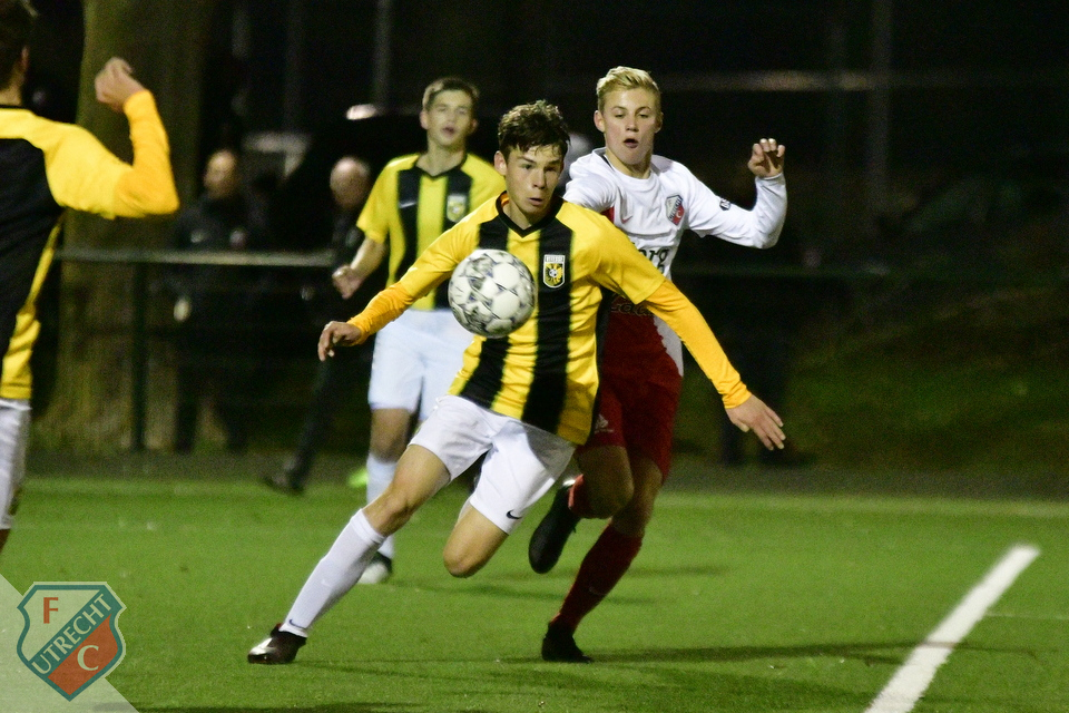 Afgelopen dinsdagavond kwam er een einde aan de bekerillusies van Utrecht O17. Na een knotsgekke slotfase waar in blessuretijd drie doelpunten te noteren vielen, was Vitesse O17 na strafschoppen (5-6) te sterk. FC Utrecht dacht te klus wel even te kunnen klaren, daar reeds ruim een week geleden een 2-0 zege op de Arnhemmers in de competitie te noteren viel. Anders kun je de slechte, en dat is een understatement, eerste helft van de Domstedelingen niet verklaren. Al binnen de minuut na het eerste fluitsignaal van arbiter De Vink, was er een onbegrijpelijk misverstand tussen keeper Steyn Gerritsen en aanvoerder Jens Guiting en pakte Vitesse het vervroegde Sinterklaascadeau dankbaar uit: 0-1. Het was een voorbode voor wat er nog komen ging. Voor rust was er geen enkele uitgespeelde kans en zorgde de anders zo degelijke achterhoede voor nog enkele hachelijke momenten. Vitesse kon nog eenmaal profiteren en zodoende begon Utrecht aan de tweede helft met een 0-2 achterstand. Trainer Rudy Jansen bracht O16 speler Aurelio Oehlers voor de onzichtbare Juruël Bernadina en Stan Wassenaar voor middenvelder Siep Keulemans. O17 begon vanaf minuut 1 met een belegering van de Vitesse defensie. Maar toen Vitesse na slordig balverlies aan Utrechtse zijde bij een uitval voor 0-3 zorgde leek de wedstrijd gespeeld. Het tekent de strijdlust van de Utrechters dat zij zich daar nog niet bij neerlegden. De watervlugge Oehlers zordge al snel na de Arnhemse treffer voor paniek in de Vitesse defensie, waarop Mohamed Akharaz voor de 1-3 zorgde. En tien minuten later nam Jens Guiting een afgeslagen hoekschop in één keer op de pantoffer voor de aansluitingstreffer. Utrecht ging daarna op zoek naar de gelijkmaker, maar dat ging veel te gehaast en zonder overleg. In de negentigste minuut viel dan ook de beslissing: spits Eray Surul zorgde met zijn vierde treffer voor de genadeklap. Beslissing? Genadeklap? O17 dacht daar anders over en wist binnen twee minuten alsnog een gelijkspel uit het vuur te slepen: Dion Versluis versloeg keeper Nigel van Haveren in de korte hoek en Oehlers bekroonde zijn prima invalbeurt met een mooie lob over diezelfde Van Haveren heen. Alle moeite bleek helaas voor niets want daar waar Utrecht vanaf de strafschopstip drie keer miste, deed Vitesse dat slechts twee keer, dus was er na 8 strafschoppen enorme teleurstelling bij O17.Trainer Rudy Jansen had graag verder doorgedrongen in het bekertoernooi: "Alhoewel we wat andere jongens vanavond de kans hebben gegeven, moeten we voldoende kwaliteit hebben om Vitesse te verslaan. Maar wat we voor rust hebben laten zien, beantwoordde niet aan die kwaliteit. Alhoewel het na rust niet veel beter was, hebben we wel met z'n allen tot en met de blessuretijd gestreden voor een goed resultaat, daarvoor moet ik de jongens een compliment geven. Dat je er dan toch met strafschoppen uitvliegt, dat is zuur."