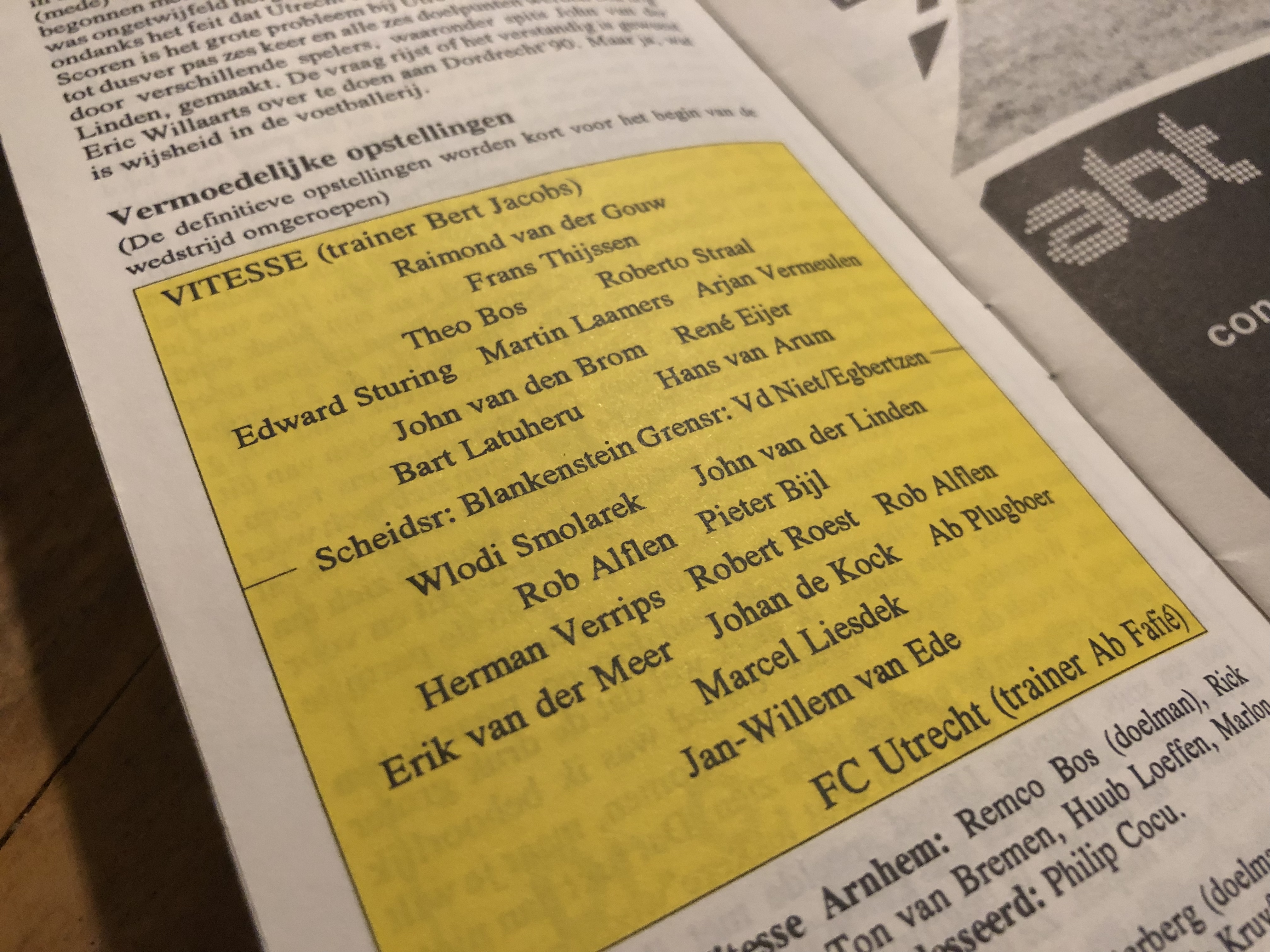 De oefenmeester van Vitesse heeft in 1990 zijn eigen rubriek in het programmaboekje. Bert’s Beschouwing, heet die kolom. De trainer deelt er zijn visie op de recente ontwikkelingen. ‘De eerstvolgende wedstrijd is altijd de belangrijkste en vandaag is dat dus tegen FC Utrecht’, stelt Jacobs. ‘Ik hoop dat mijn spelers voldoende bij de les zijn om er weer een goede wedstrijd van te maken. Daar vertrouw ik eigenlijk gewoon op. Het zijn allemaal profs die weten dat ze niet kunnen teren op de laatste wedstrijd’, is Jacobs duidelijk.