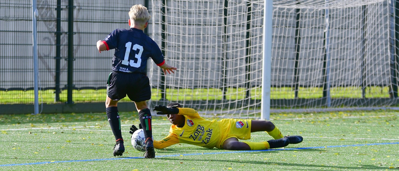 De Domstedelingen kregen vanaf het begin van de partij goed de druk op NEC O13 en dit resulteerde ook al snel in goede kansen. Dit sterke spel kon FC Utrecht O13 bijna de gehele eerste helft volhouden. Maar op een moment dat NEC O13 een tegenaanval plaatste, werd een doorgebroken speler neergehaald en een penalty aan de Nijmegenaren toegekend. Die pingel werd benut: 1-0.