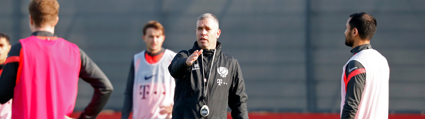 “Ja, dat is wel even omschakelen.” Dat zijn de woorden van René Hake op de vraag hoe het voor hem is om hier nu te staan. “Dit is iets waar ik een dag geleden nog geen rekening mee had gehouden.” De 48-jarige oefenmeester stond vandaag voor een relatief nieuwe spelersgroep. “Dat is altijd spannend. Natuurlijk ken je al heel veel jongens omdat je al lang in het betaald voetbal werkzaam bent. Veel jongens hebben al een keer tegen me gespeeld, kan me even niet zo snel herinneren of ik ook met één van de jongens heb samengewerkt. Je bent in ieder geval geen onbekende voor ze, alleen toch is het wel weer nieuw. Dat geldt voor hun, omdat ik in een andere rol bij hen kom nu, maar dat geldt ook voor mij. Het is altijd even weer een nieuw moment, maar wel een leuk moment.”
