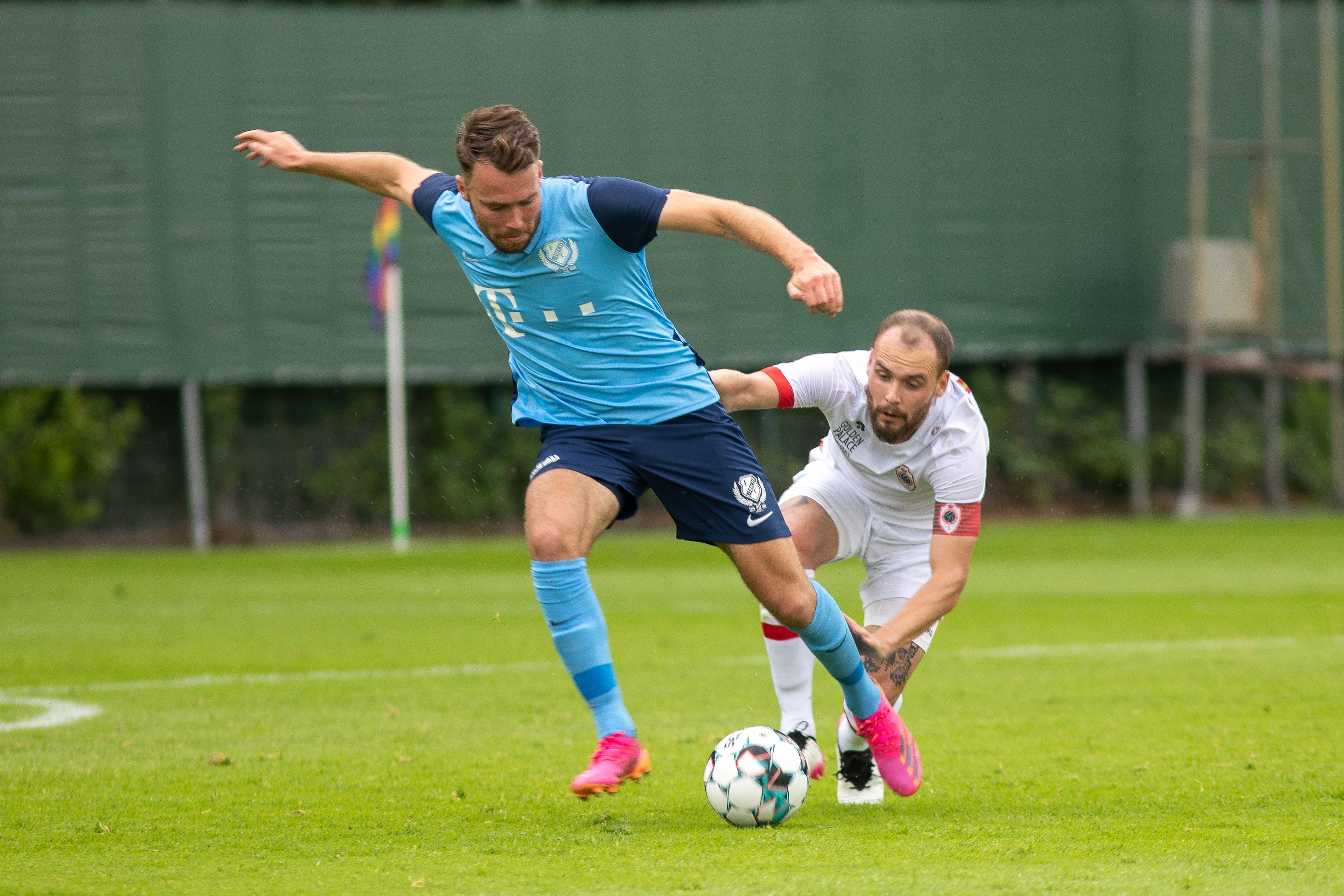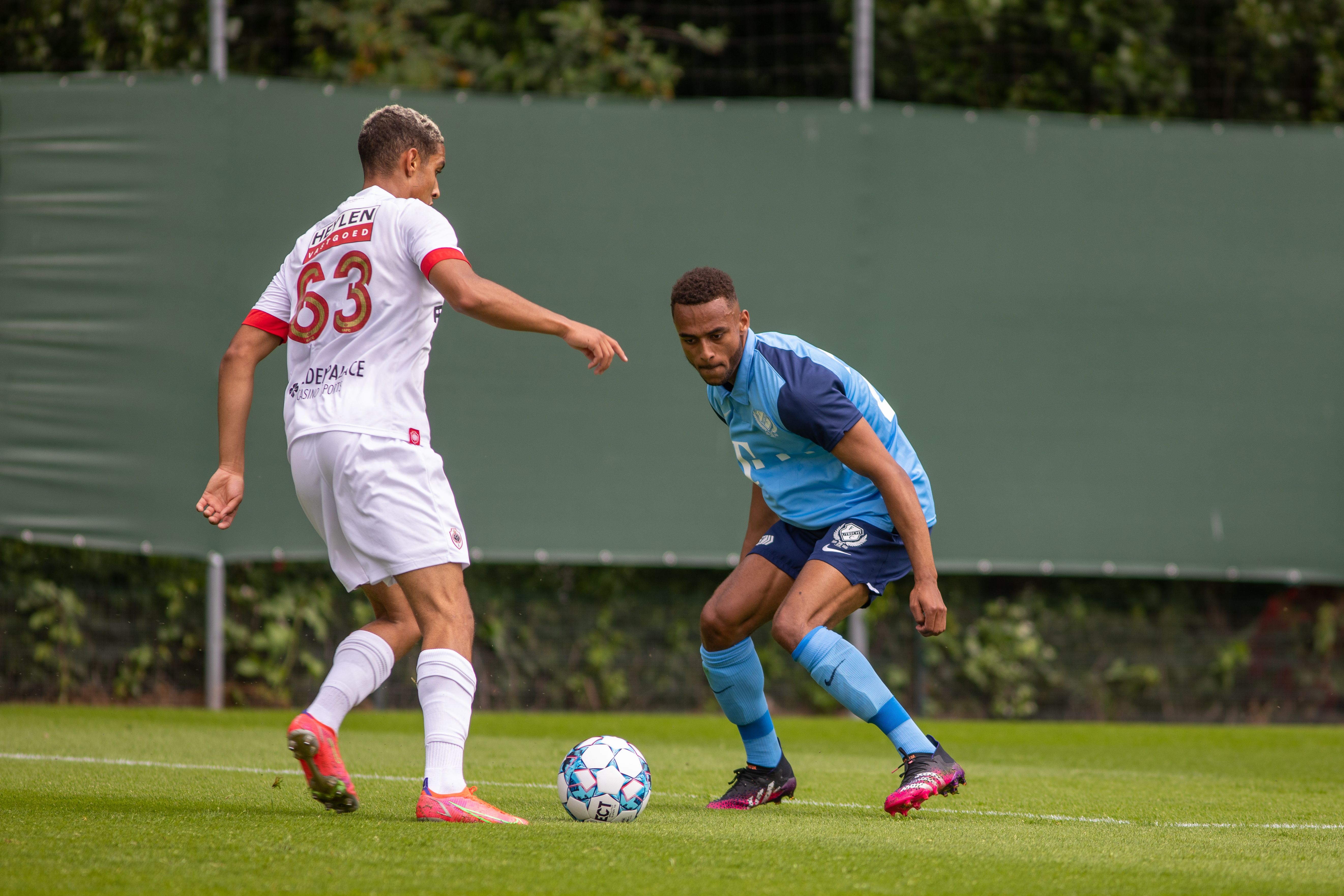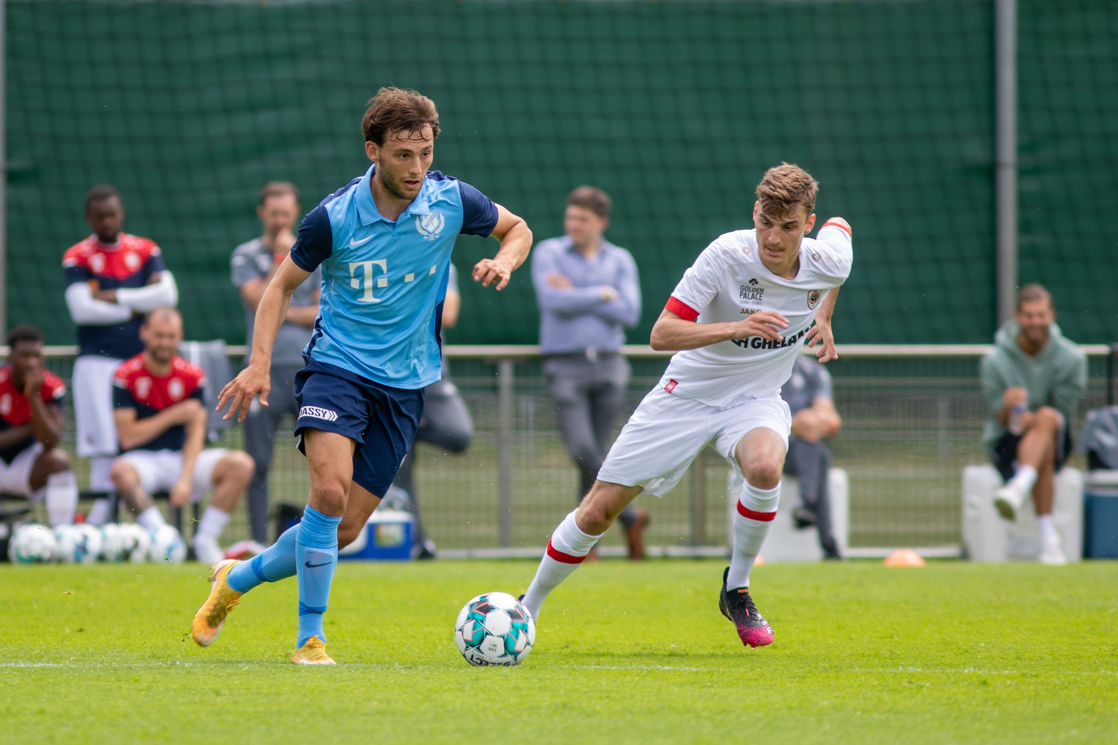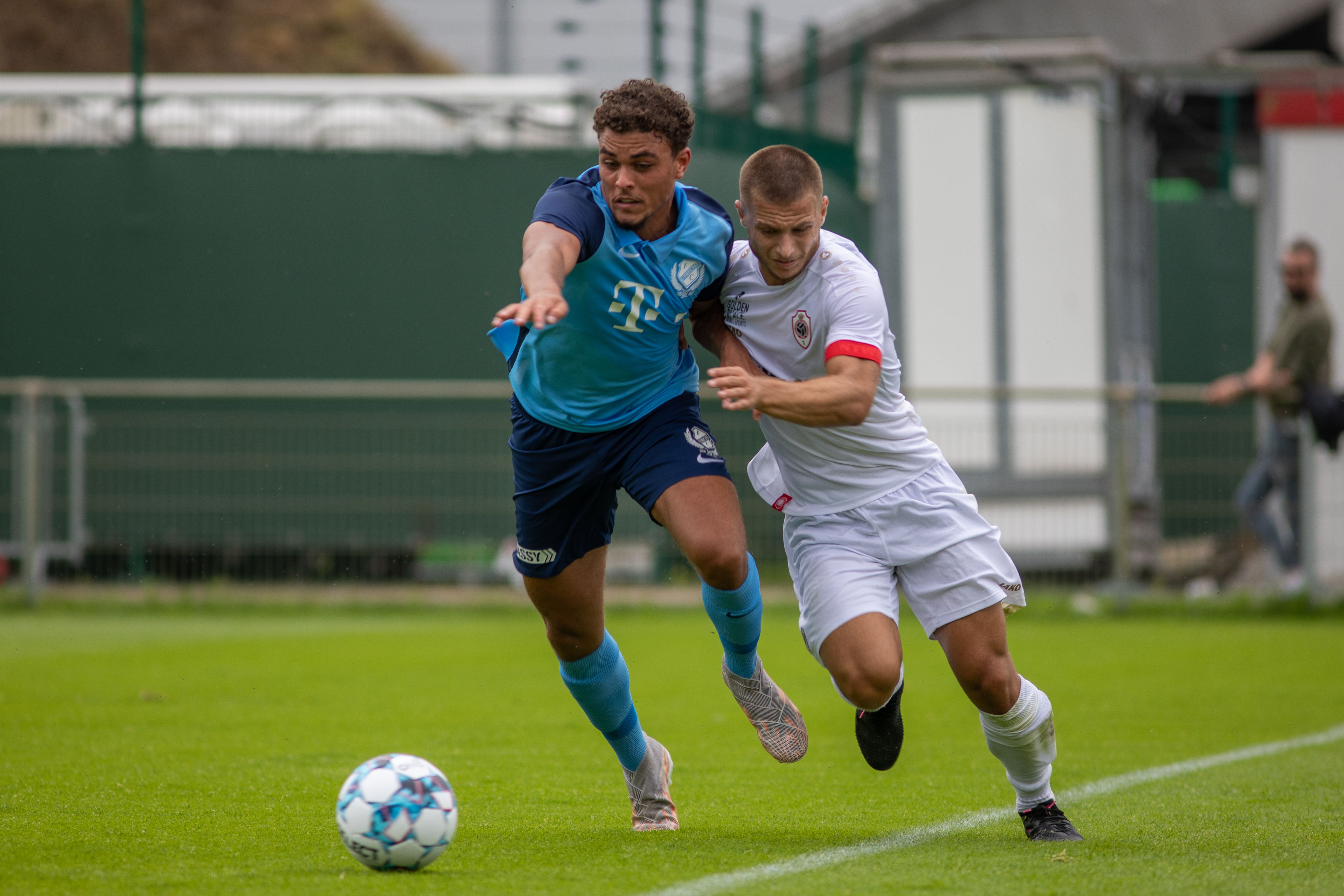 Pats! Daar is het bijna raak; maar net niet helemaal. Moussa Sylla besluit een mooie actie over de rechterflank met een schot dat op de paal eindigt. Keeper Jean Butez van Royal Antwerp FC krijgt nog twee keer vaker een helpende hand toegereikt door het aluminium in de eerste helft van de oefenpartij. De tweede keer dat de goalie van de Belgische ploeg wordt gered door het aluminium is dat na een inzet van Joris van Overeem. Een door de middenvelder met veel gevoel gechipte bal eindigt op de lat. En de derde FC Utrecht’er die op het veld naast het imposante Bosuilstadion enorm dicht bij een doelpunt is, is Bart Ramselaar. Zijn schot eindigt op de lat.