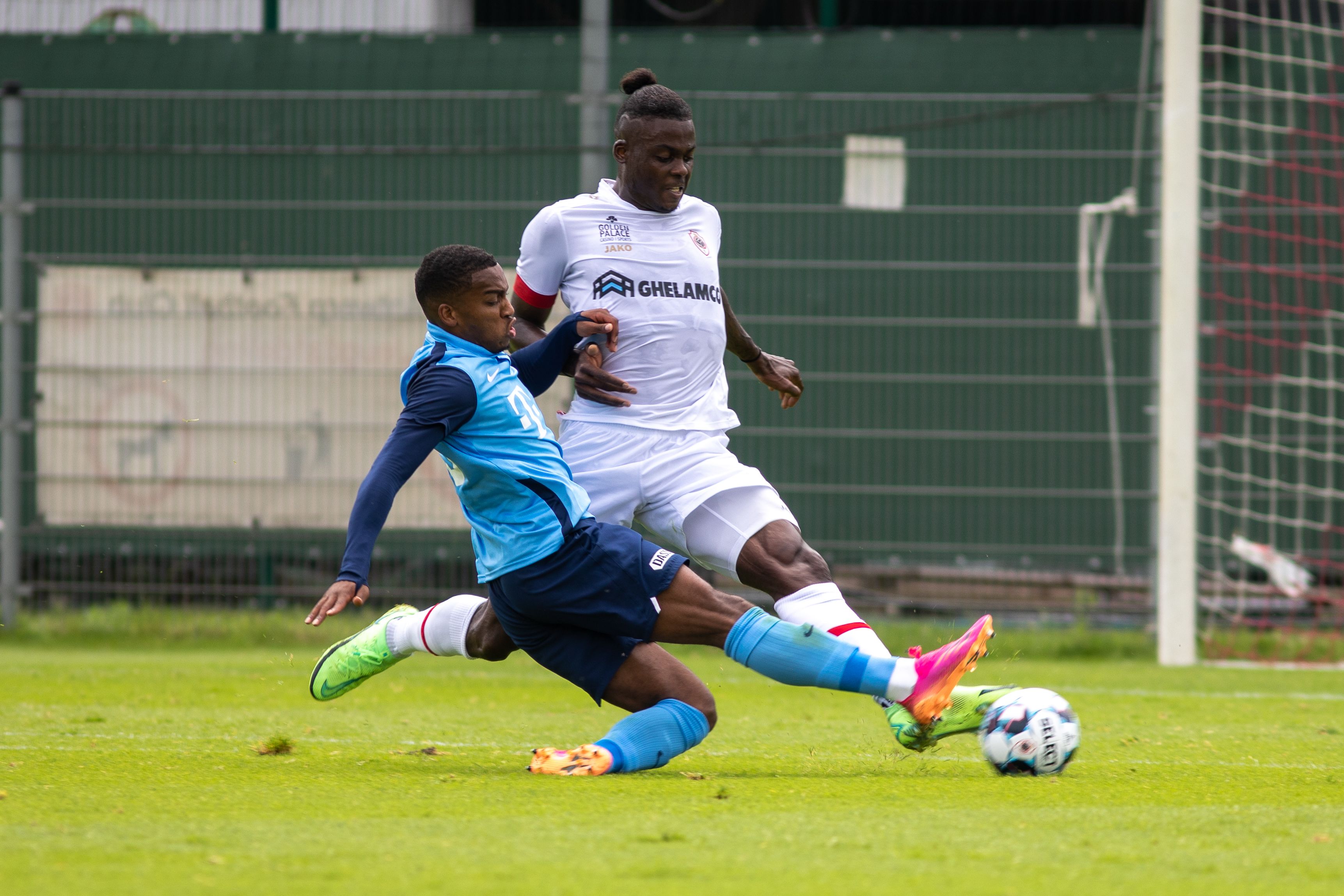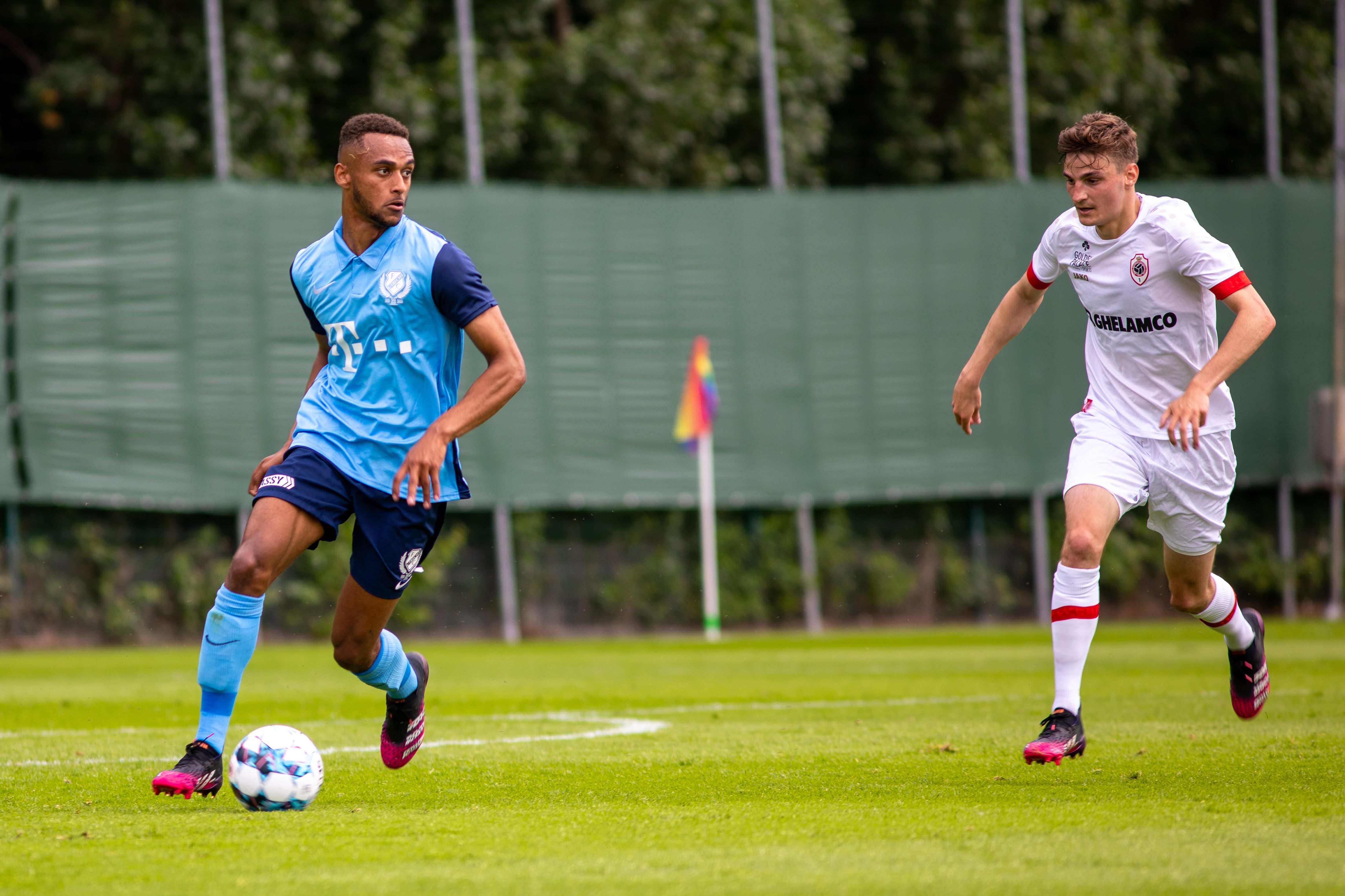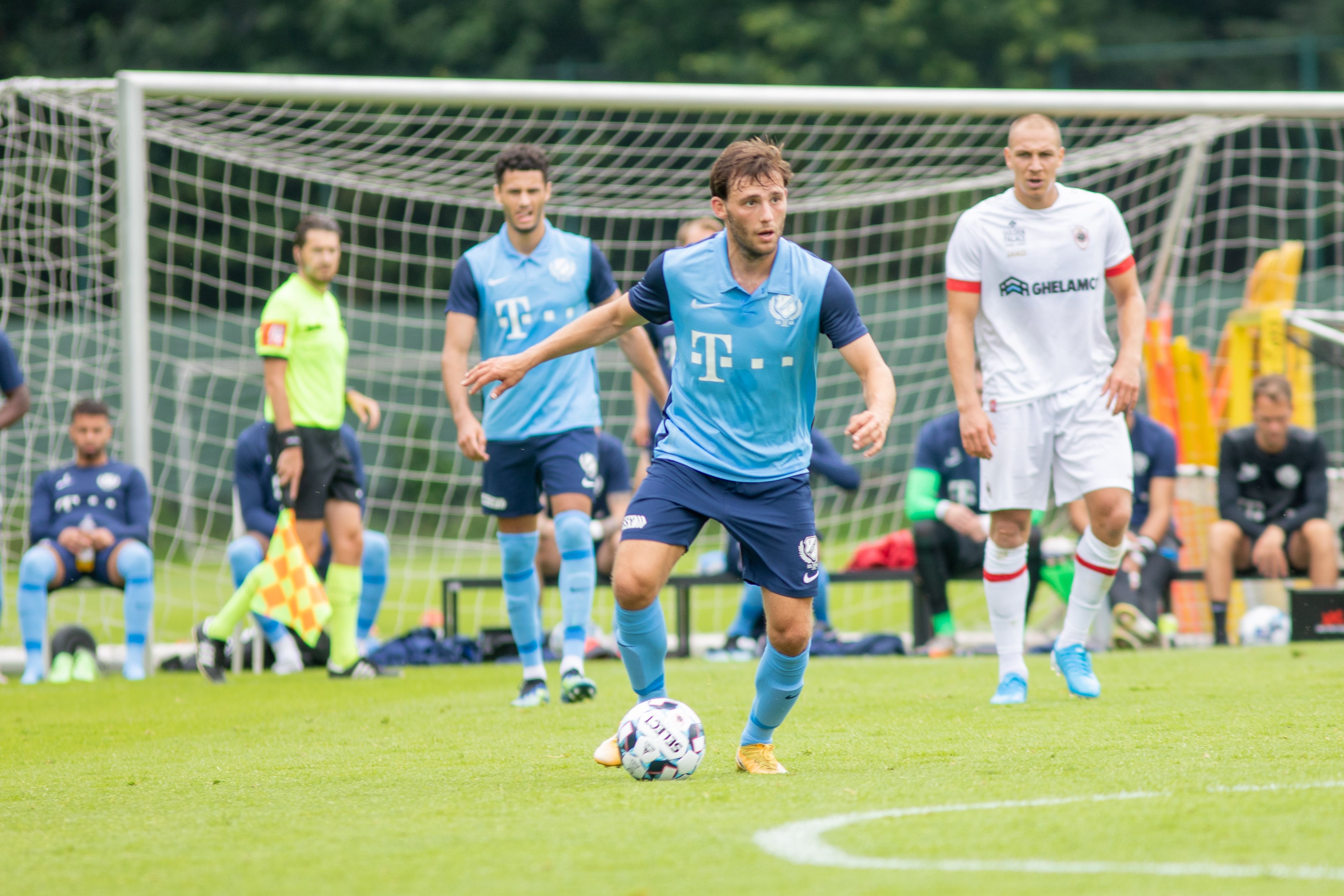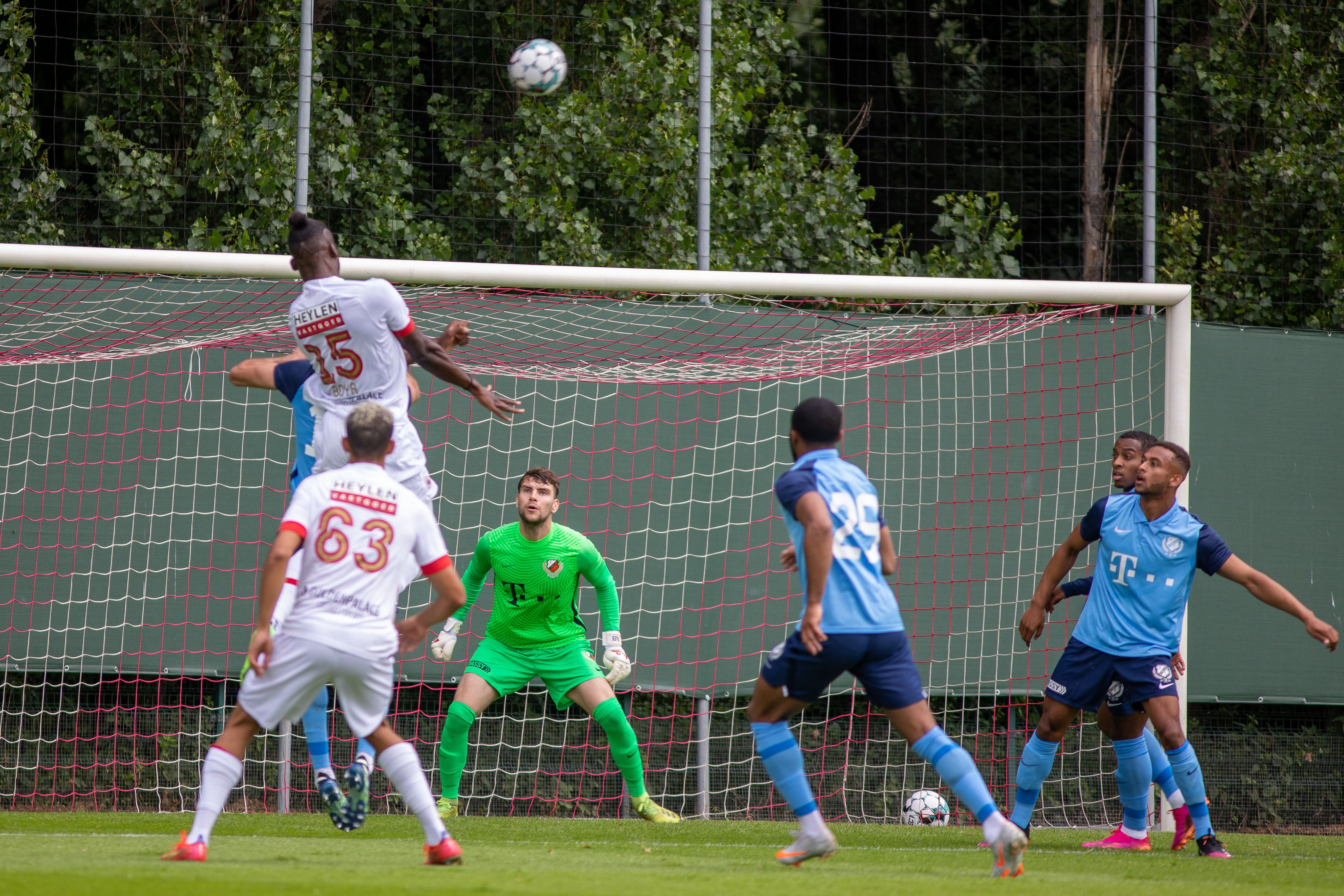 Pats! Daar is het bijna raak; maar net niet helemaal. Moussa Sylla besluit een mooie actie over de rechterflank met een schot dat op de paal eindigt. Keeper Jean Butez van Royal Antwerp FC krijgt nog twee keer vaker een helpende hand toegereikt door het aluminium in de eerste helft van de oefenpartij. De tweede keer dat de goalie van de Belgische ploeg wordt gered door het aluminium is dat na een inzet van Joris van Overeem. Een door de middenvelder met veel gevoel gechipte bal eindigt op de lat. En de derde FC Utrecht’er die op het veld naast het imposante Bosuilstadion enorm dicht bij een doelpunt is, is Bart Ramselaar. Zijn schot eindigt op de lat.