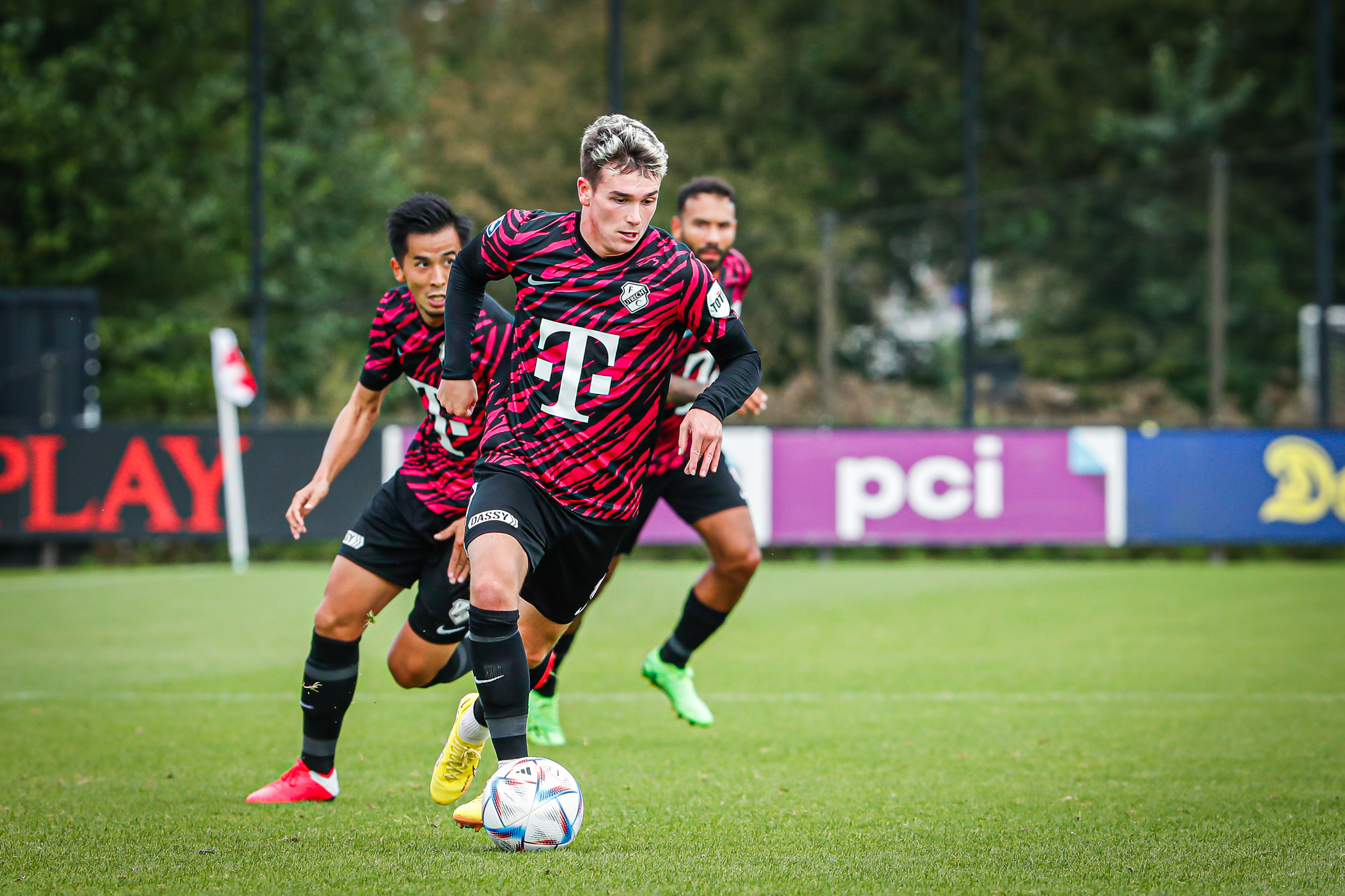 In het vriendschappelijke duel, waarin (jeugd)internationals uit Nederland, Duitsland, Japan, Frankrijk, Verenigde Staten, Suriname, Argentinië, Oostenrijk en Italië in actie komen, vindt FC Utrecht naarmate de minuten verstrijken steeds beter zijn draai. Dat resulteert na een dik half uur in de gelijkmaker. Naoki Maeda zet de bal voor, Luuk Brouwers kopt even hard als vastberaden raak: 1-1. De oerkreet die volgt, bewijst maar weer: het mag dan een oefenpot zijn, er wordt gespeeld met de intensiteit die je bij een duel om het echie zou verwachten.