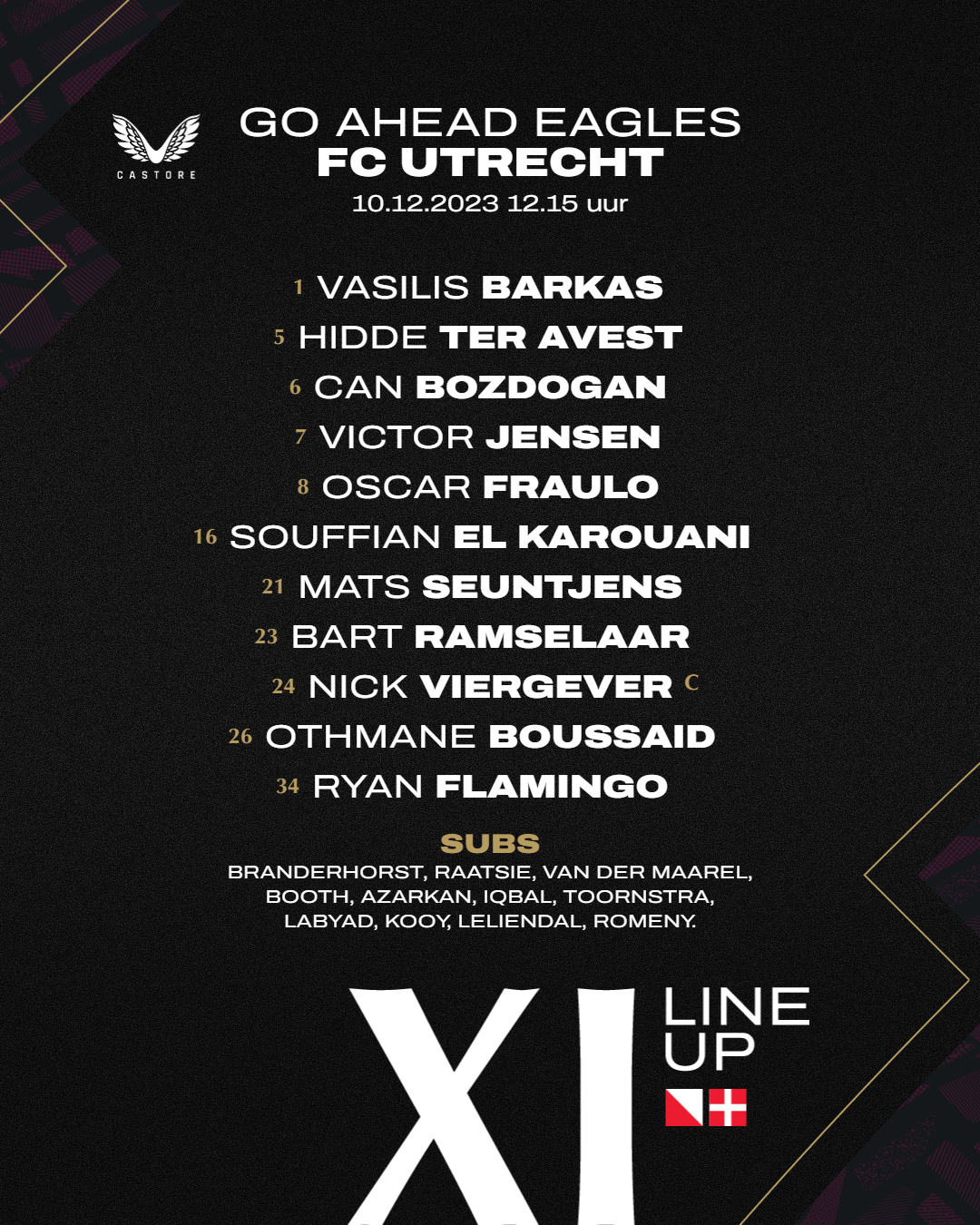 𝗫𝗜 𝗚𝗼 𝗔𝗵𝗲𝗮𝗱 𝗘𝗮𝗴𝗹𝗲𝘀: Jeffrey de Lange; Mats Deijl, Jamal Amofa, Joris Kramer, Bas Kuipers; Philippe Rommens, Willum Willumsson, Enric Llansana; Jakob Breum, Sylla Sow, Oliver Edvardsen.#gaeutr pic.twitter.com/FWMjasD17B