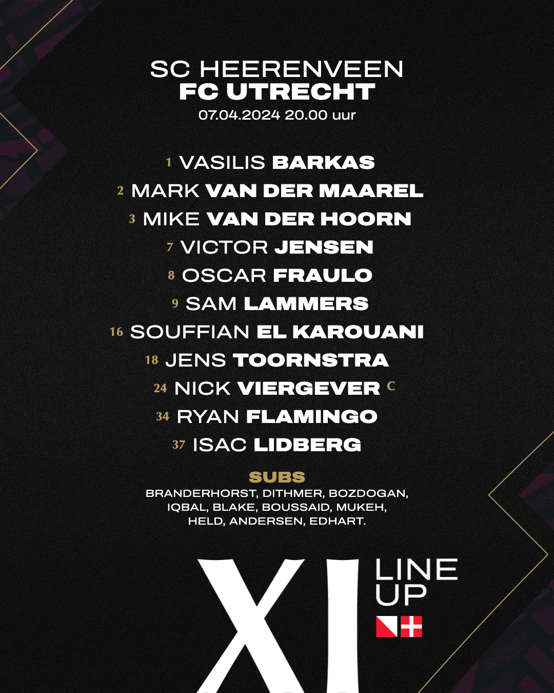 Vasilis Barkas; Mark van der Maarel (66. Nazjir Held), Mike van der Hoorn, Nick Viergever, Souffian El Karouani; Ryan Flamingo, Oscar Fraulo (89. Can Bozdogan), Jens Toornstra (84. Zidane Iqbal); Victor Jensen (66. Othmane Boussaid), Sam Lammers, Isac Lidberg (89. Adrian Blake).